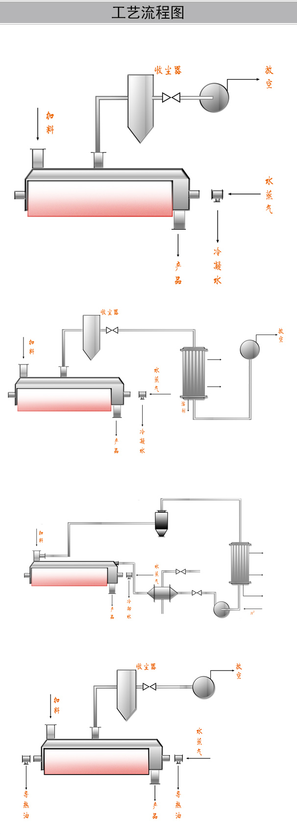 3、處理物料范圍廣:使用不同熱介質(zhì),即可處理熱敏性物料,又可處理需要高溫處理的物料。 常用介質(zhì)有:水蒸氣、大熱有、熱水、冷卻水等。即可連續(xù)操作也可間歇操作,可在很多領(lǐng)域應(yīng)用。